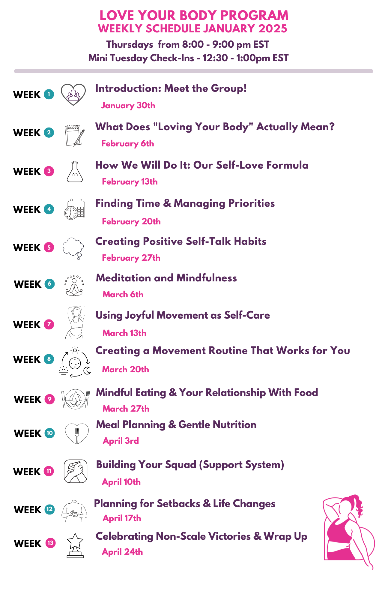 The Love Your Body Program only runs a few times each year. If you are not ready yet to take the step, make sure to get on our waitlist to be the first in line for the next round! To join the waitlist, click here to add your name to the waitlist